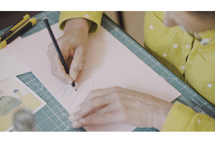 Een persoon tekent met een pen op een stuk papier dat op een snijmat ligt. Op de tafel liggen een liniaal, een potlood, en wat kleine snijplankjes.
